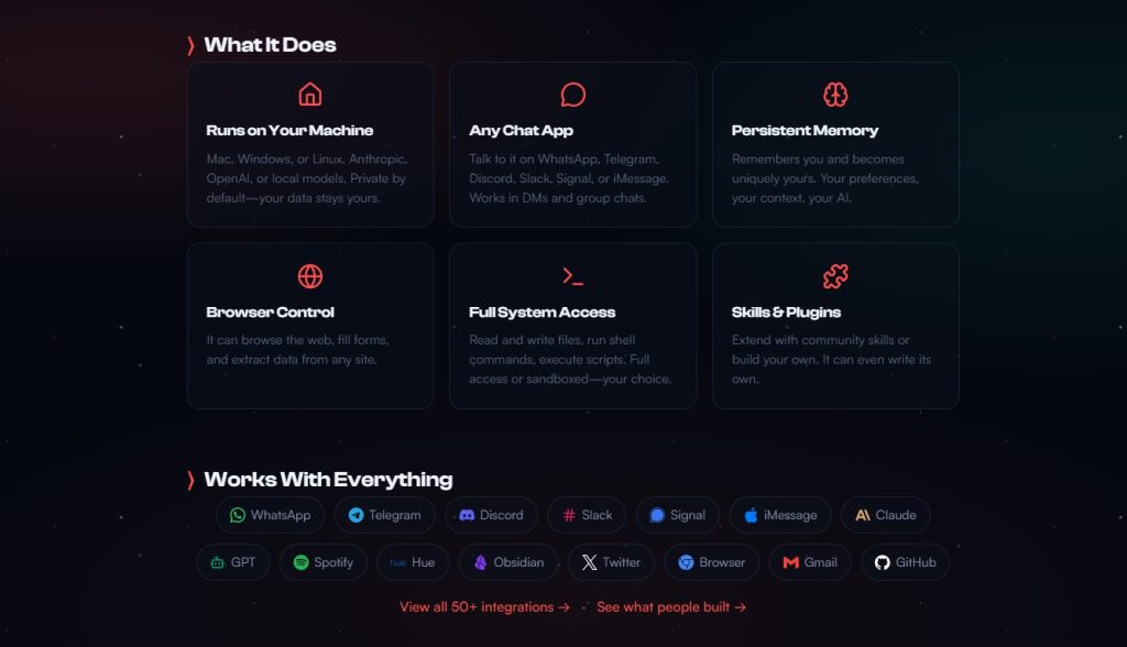 - Takes real actions (agentic AI style): clears inbox & drafts replies, books flights & checks you in, manages calendar/events, controls smart home (Hue lights, Spotify, Sonos), browses/fills forms, runs terminal commands/scripts, git commits, even builds small tools on request