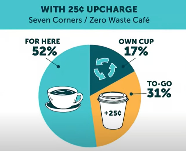 When they tracked customer behavior before and after implementing the upcharge, the use of disposable to-go cups dropped from 66% to 30%. This shift effectively halved the number of cups heading to landfills.